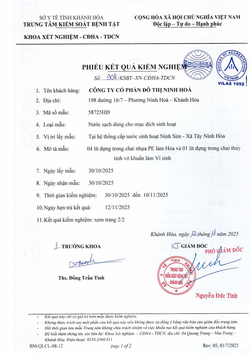 Kết quả xét nghiệm nước tháng 10-2025(hệ thống Ninh Sim)