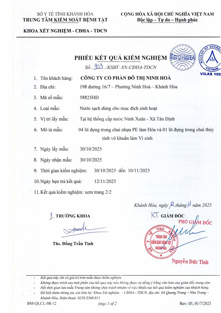 Kết quả xét nghiệm nước tháng 12-2025(hệ thống Ninh Xuân)