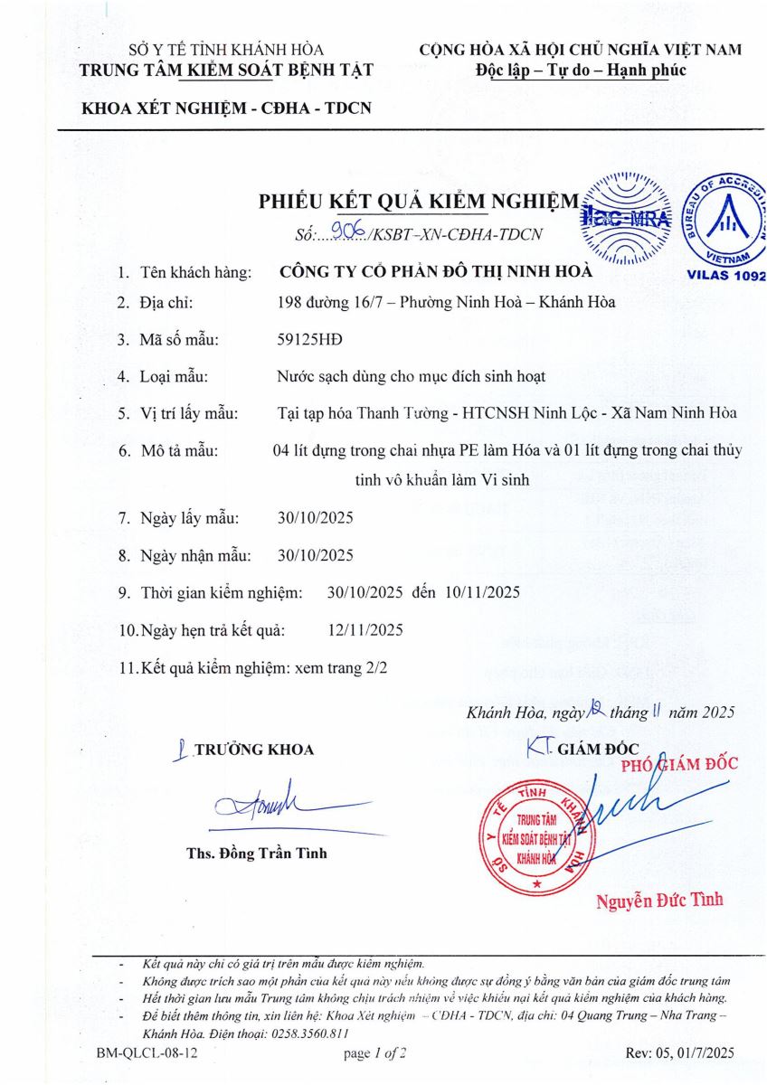 Kết quả xét nghiệm nước tháng 10-2025(hệ thống Ninh Lộc)