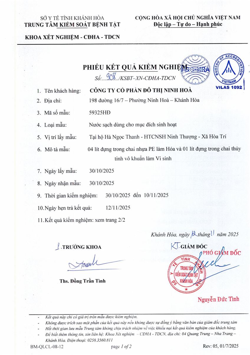 Kết quả xét nghiệm nước tháng 10-2025(hệ thống Ninh Thượng)