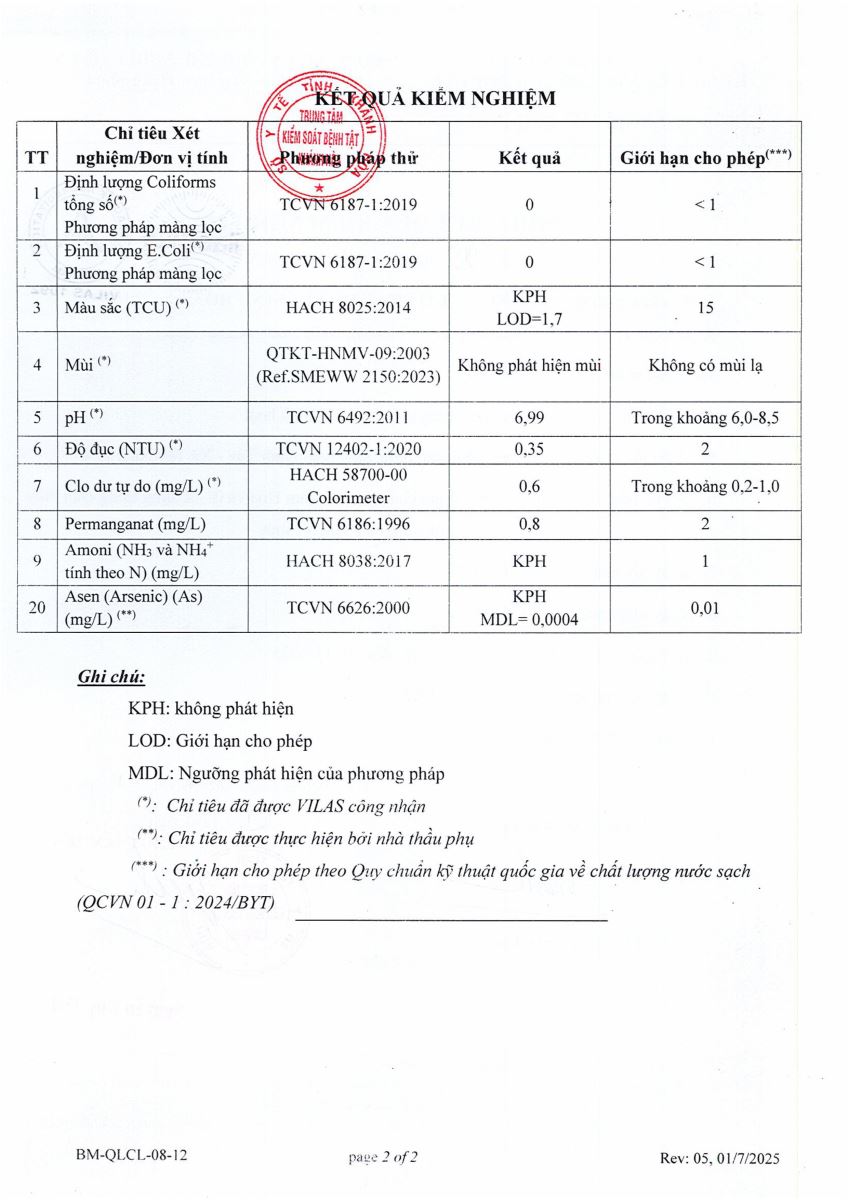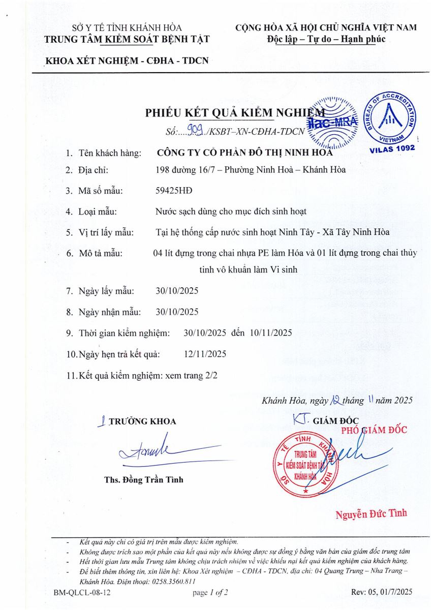 Kết quả xét nghiệm nước tháng 12-2025(hệ thống Ninh Tân)