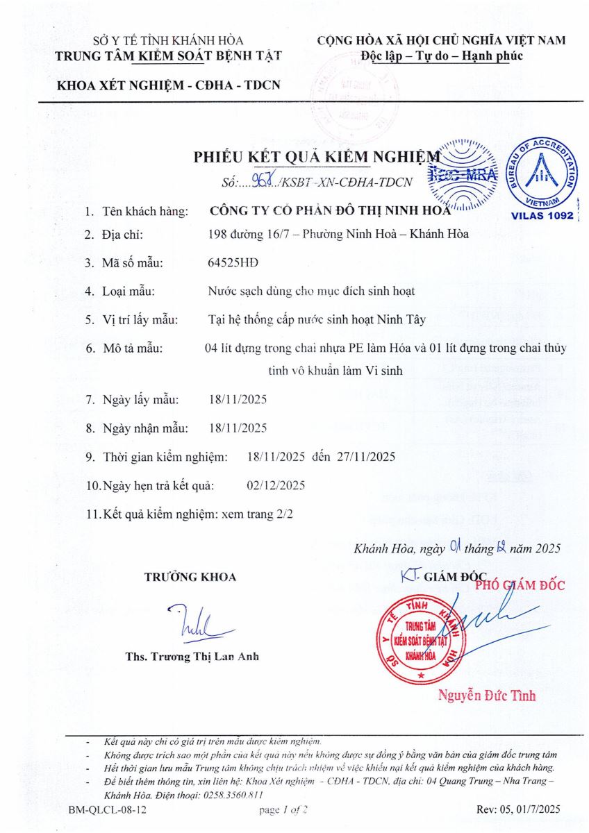 Kết quả xét nghiệm nước tháng 12-2025(hệ thống Ninh Trung)