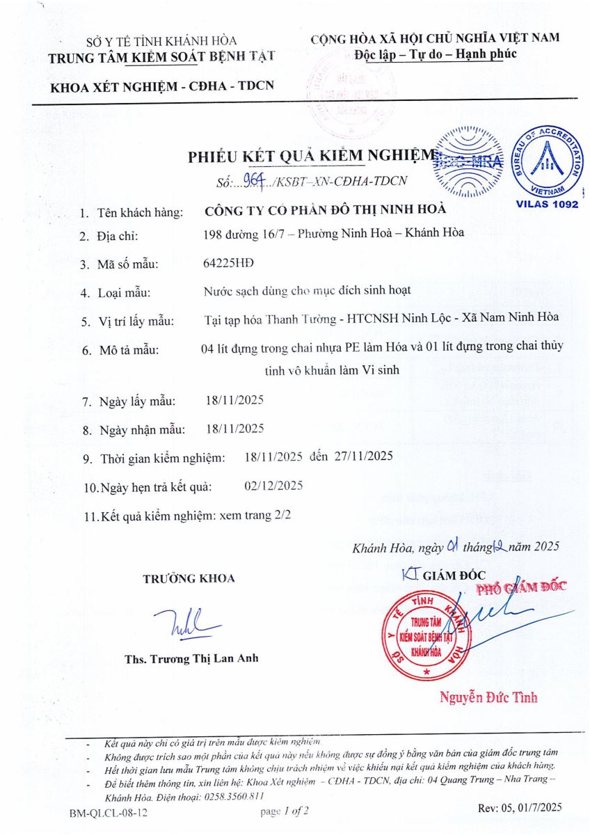 Kết quả xét nghiệm nước tháng 12-2025(hệ thống Ninh Trung)