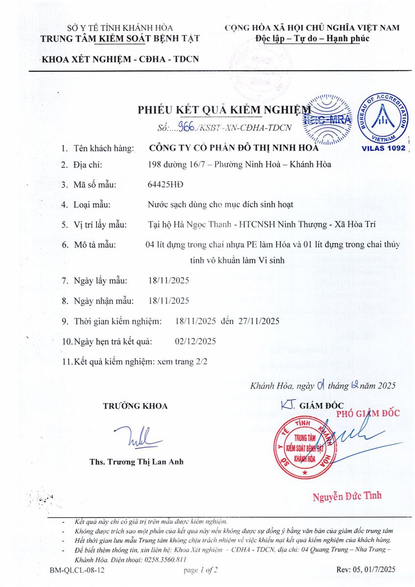 Kết quả xét nghiệm nước tháng 12-2025(hệ thống Ninh Trung)