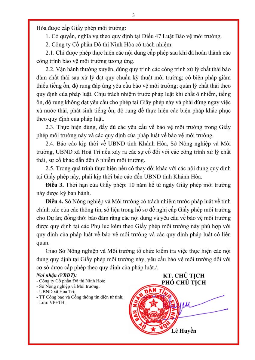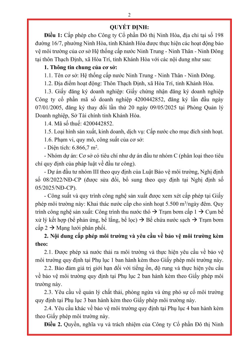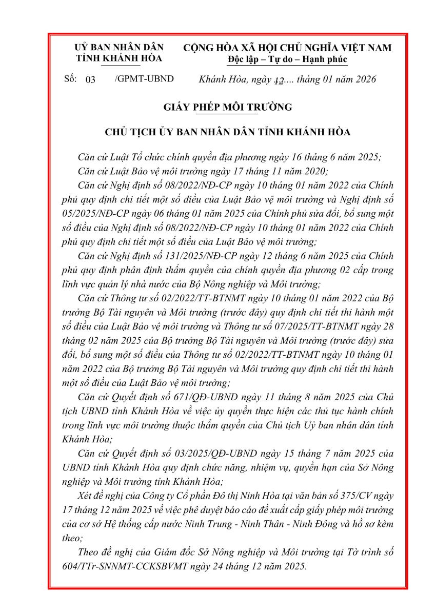 UBND Tỉnh Khánh Hòa cấp giấy phép môi trường cho Hệ thống cấp nước Ninh Trung - Ninh Thân - Ninh Đông