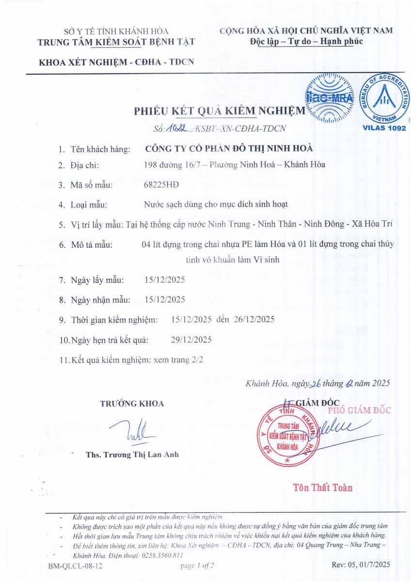 Kết quả xét nghiệm nước tháng 12-2025(hệ thống Ninh Trung)