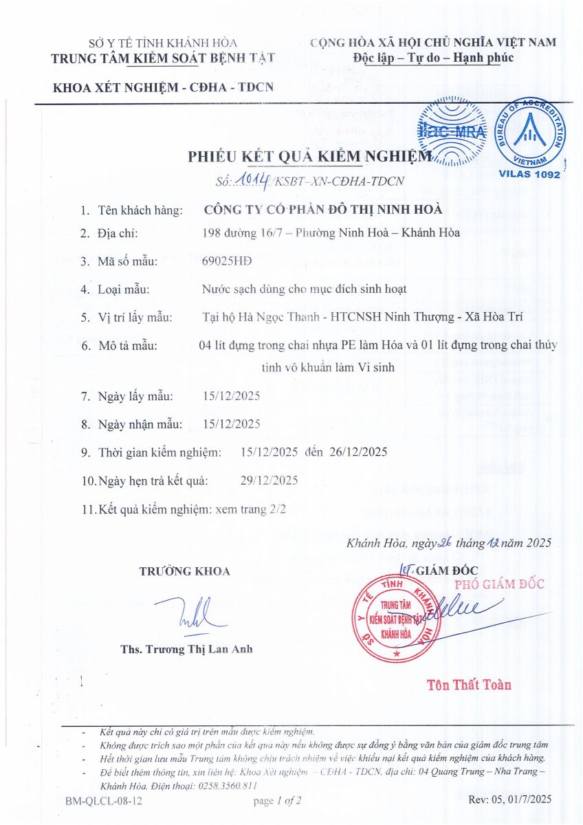 Kết quả xét nghiệm nước tháng 12-2025(hệ thống Ninh Thượng)
