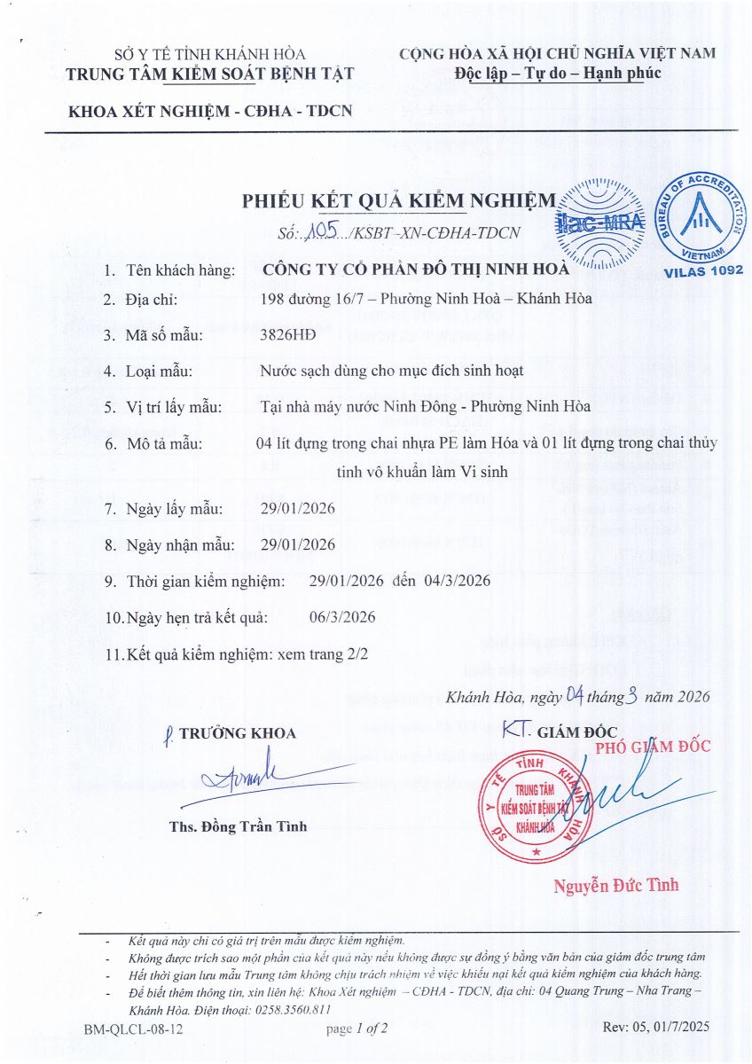 Kết quả xét nghiệm nước tháng 1-2026(hệ thống Ninh Đông)