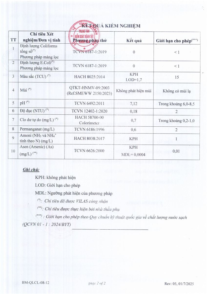 Kết quả xét nghiệm nước