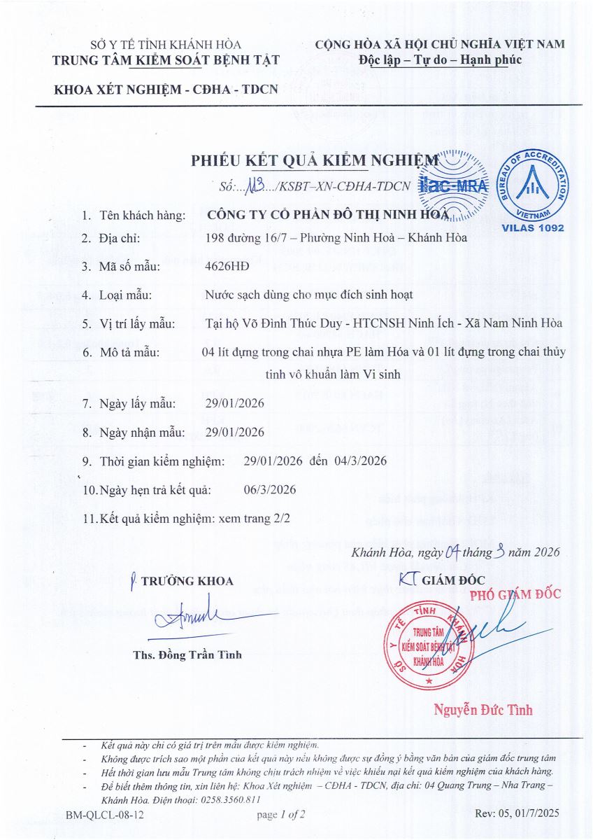 Kết quả xét nghiệm nước tháng 1-2026(hệ thống Ninh Tân)