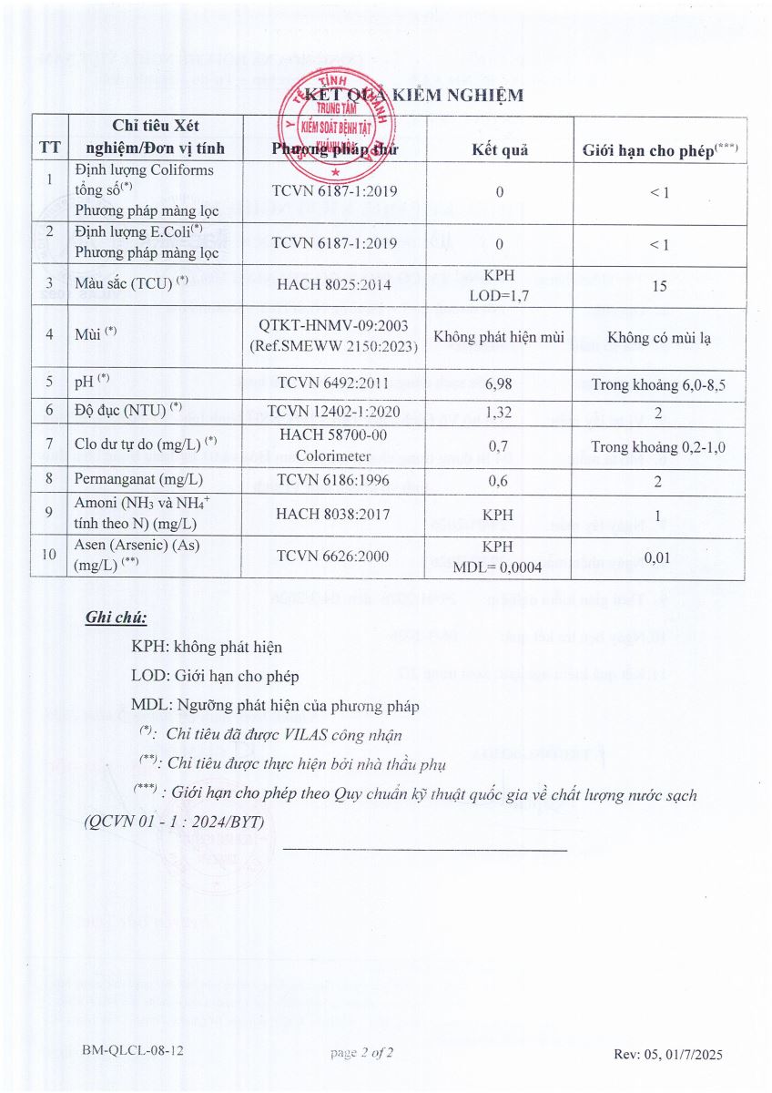 Kết quả xét nghiệm nước tháng 1-2026(hệ thống Ninh sim)