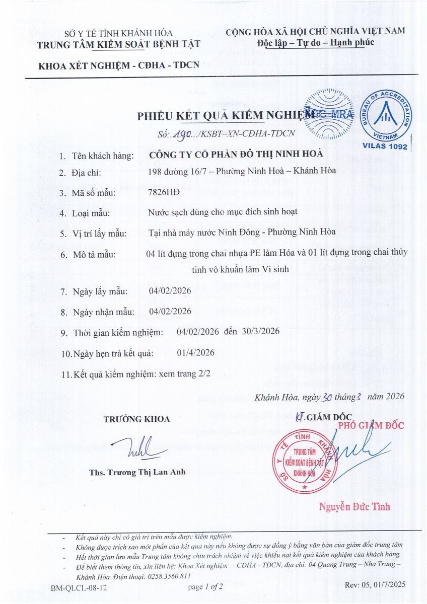 Kết quả xét nghiệm nước tháng 2-2026(hệ thống Ninh Sơn)