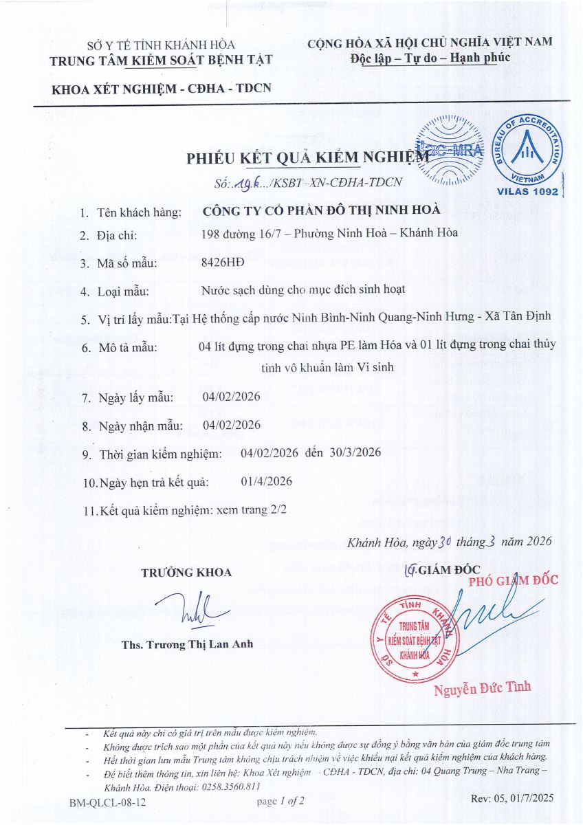 Kết quả xét nghiệm nước tháng 2-2026(hệ thống Ninh Trung)