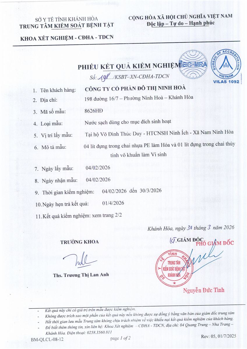 Kết quả xét nghiệm nước tháng 2-2026(hệ thống Ninh Thượng)